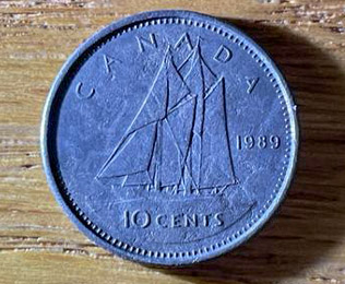 1989 Canadian dime (100% pure nickel)